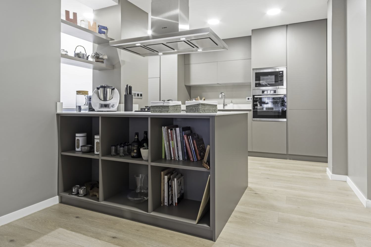 Los muebles de la Cocina fueron elegidos en el mismo color de la pintura de la vivienda, ya que sus paredes no fueron alicatadas, si no pintadas. Creamos un comedor de diario con mesa de cristal justo a la entrada de la cocina, que se accede através de una celosía de madera lacada y cristal de puertas de corredera.
